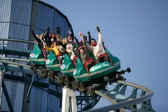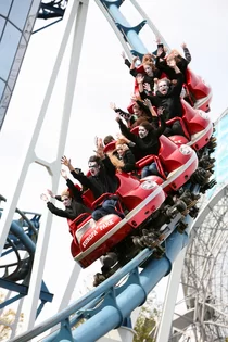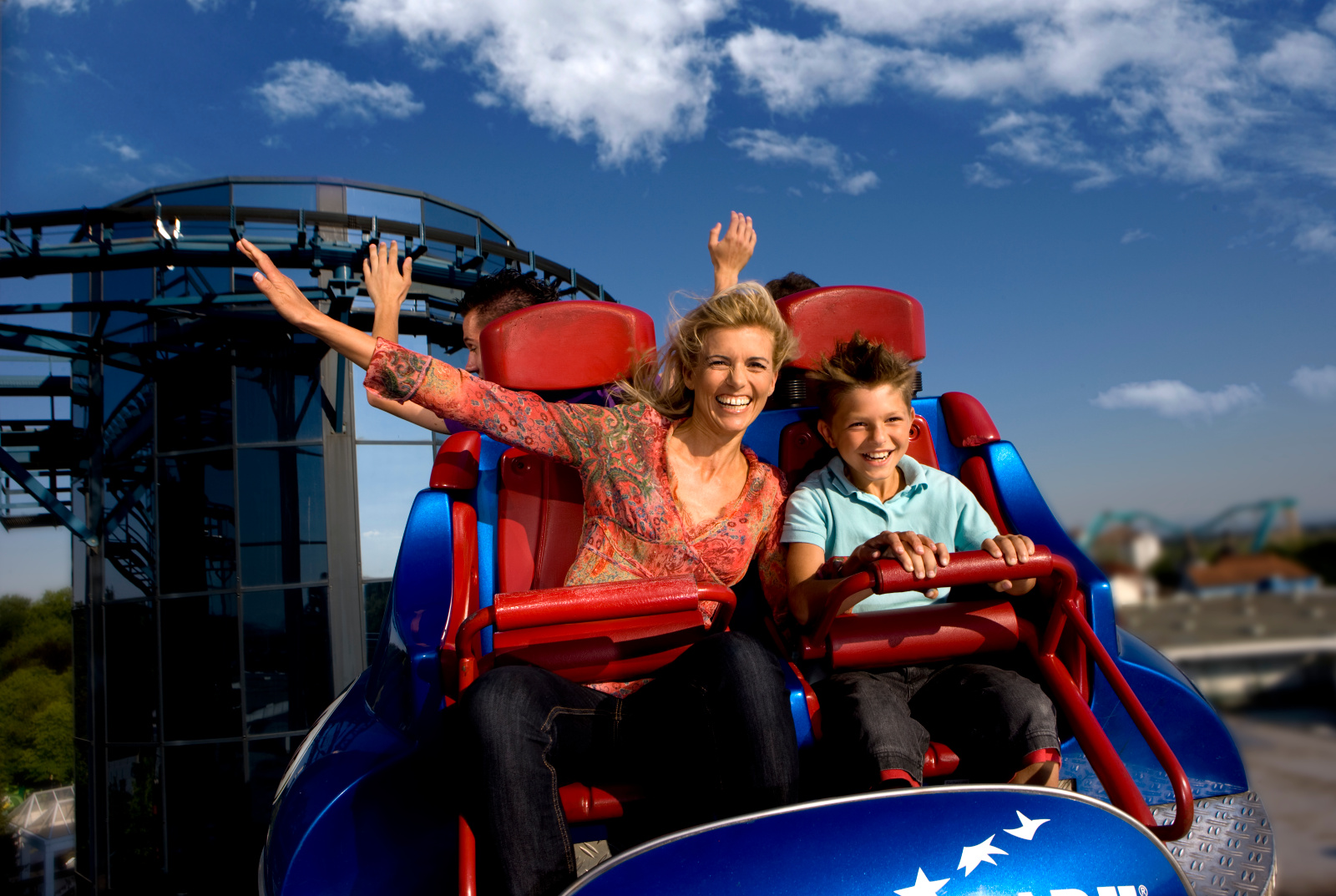 Ein spektakuläres Abenteuer erwartet Euch: Die Schienen dieser Hochgeschwindigkeitsbahn schlängeln sich eindrucksvoll um gigantische, spiegelnde Türme. Zu Beginn wirkt alles noch ganz entspannt – langsam schraubt sich die Kabine in luftige 28 Meter Höhe. Doch plötzlich geht es Schlag auf Schlag!