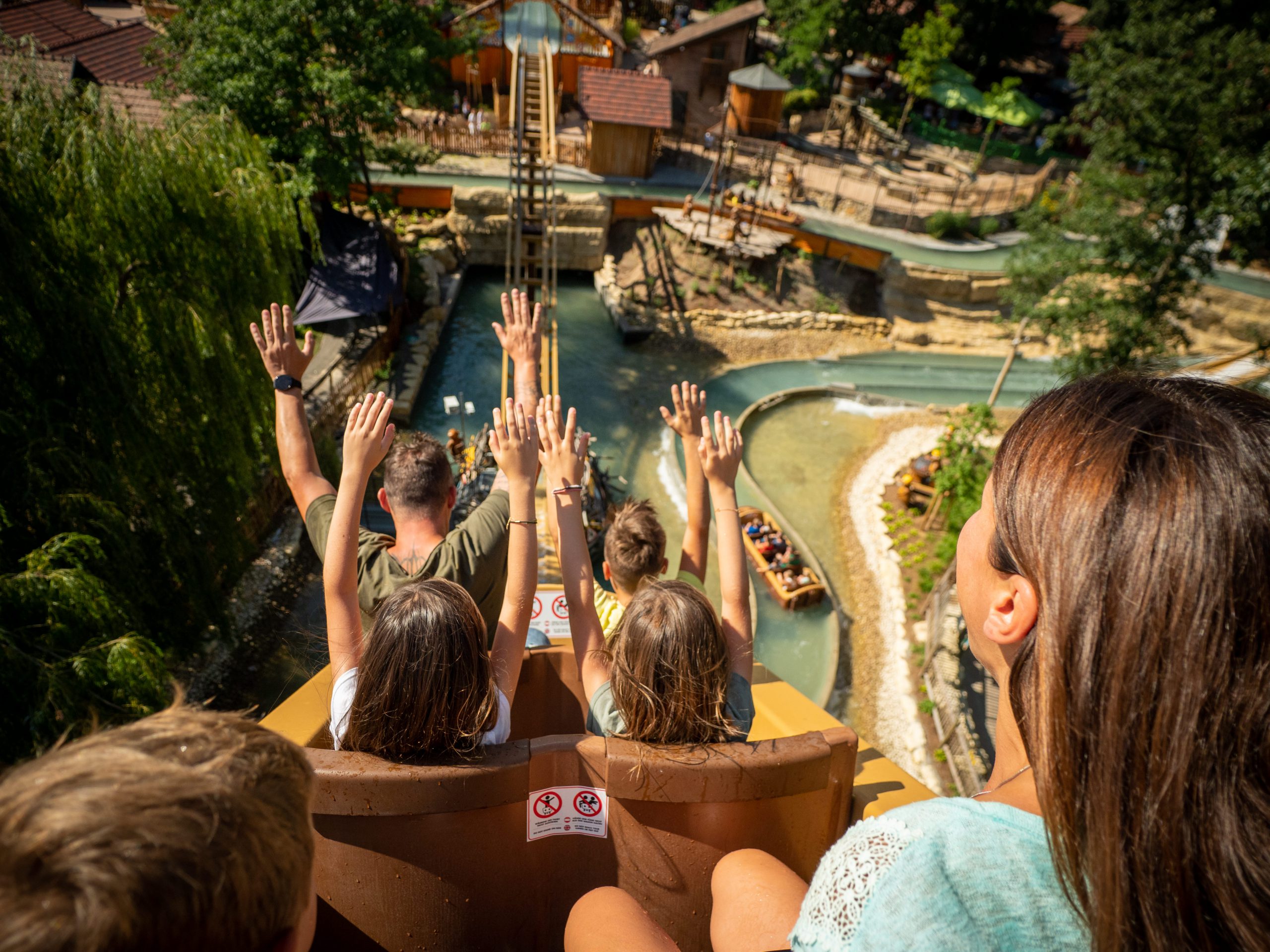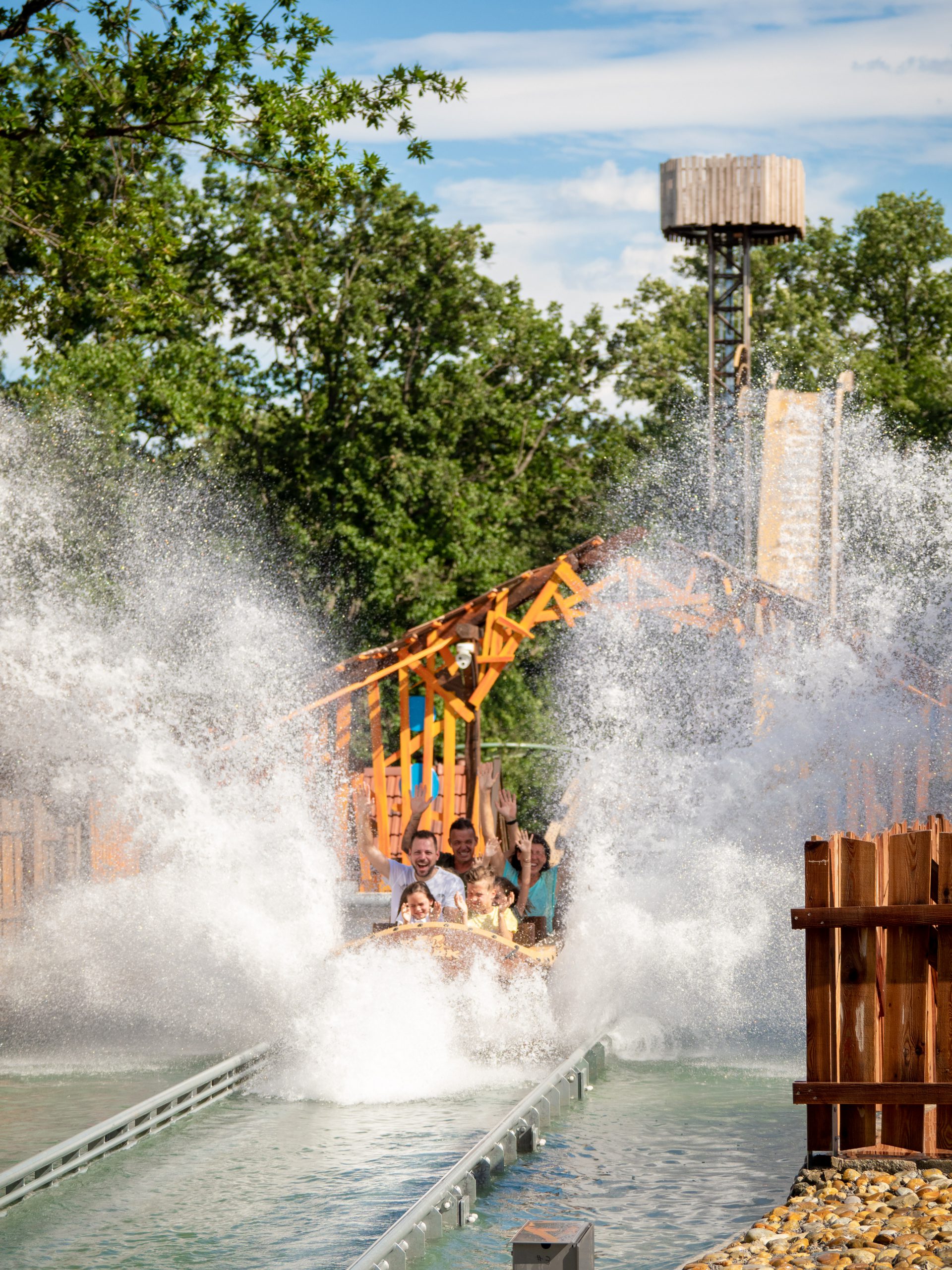 Wildwasserbahn mit 17 Meter Abfahrt und großem Splash in der Bauernhof-Welt.