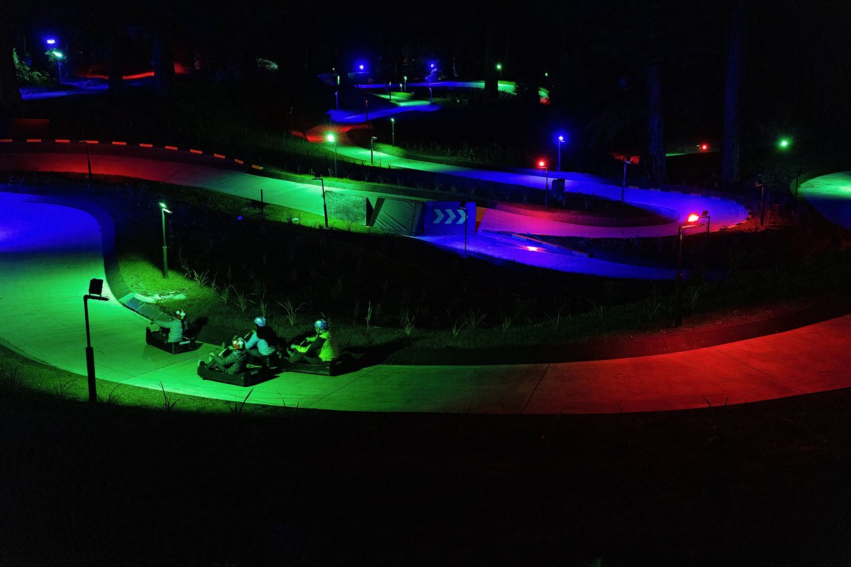 Fünf verschiedene Gravity-Kart-Strecken (Tiki Tour, Gravity, Legend, Ultra und Twister) mit insgesamt etwa 7,3 km Länge, die durch den Redwood-Wald führen.