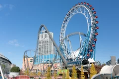 Das einzigartige Big-O Riesenrad in LaQua (Tokyo Dome City) ist ein zenterloses Wahrzeichen mit 80 m Höhe. Genieße 15-minütige Ausblicke auf Tokio, während die Thunder Dolphin-Achterbahn durch die Mitte rast. Alle 40 Gondeln bieten Karaoke – sing mit Stadtpanorama!