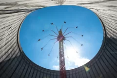 Vertical Swing ist ein 58 Meter hohes Kettenkarussell im Kühlturm von Wunderland Kalkar, das dich in luftige Höhe über den Park hebt und eine beeindruckende Aussicht bietet.